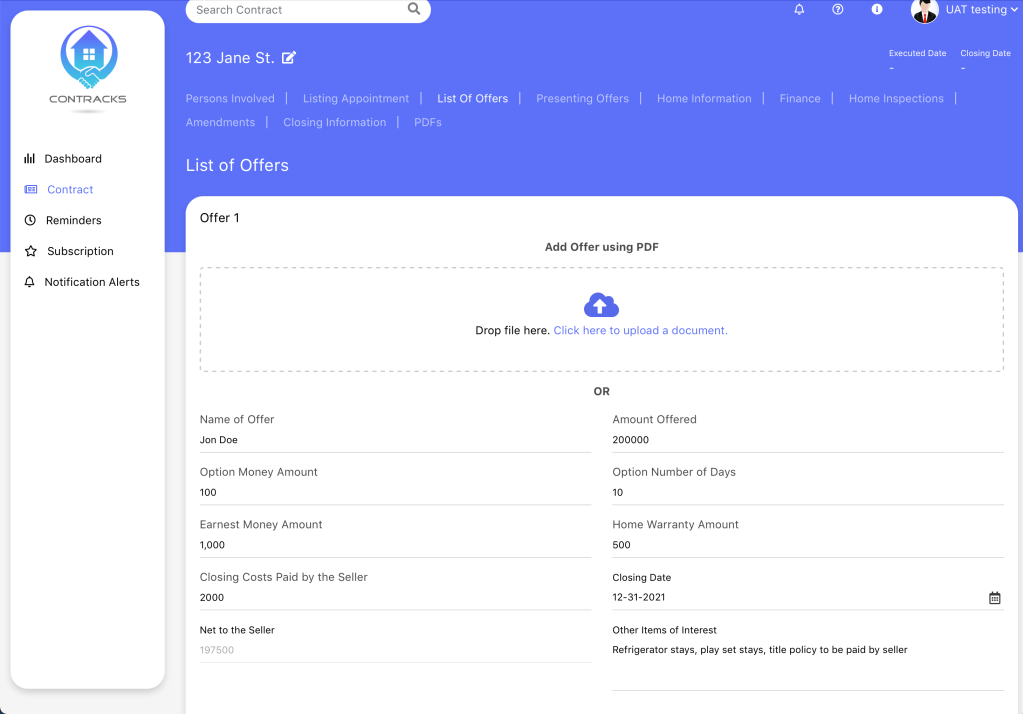When receiving offers you can manually input or upload the PDF of the contract to keep track of what each buyer is offering…this function also calculates your sellers net profit (before title fees) from the contract information.